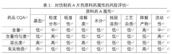 对原料药属性进行风险评估:在研发阶段一般采用低、中、高风险分级系统评估相对风险。低:为可接受的风险,无需进一步研究;中、为风险可接受,可能需要进一步研究以降低风险;高:为风险不可接受,需要进一步研究以降低风险。通过风险评估,确定原料药的高风险属性,从而确定需要进行哪些研究,来增加对产品和工艺的理解,建立相应的控制策略。对物料属性的风险评估主要基于物料的理化和生物学特性等对产品CQA的影响。对产品CQA有明显影响的极为高风险属性。下表为仿制药A片剂原料药属性的风险评估实例,由于各制剂所用原辅料的特性,该风险评估额合理性说明不在阐述。