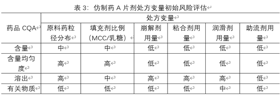 3.1.3处方变量初始风险评估:某仿制药A片剂示例见下表,由于各制剂特性及所用辅料的特性,该风险评估额合理性说明不在阐述。