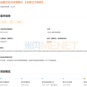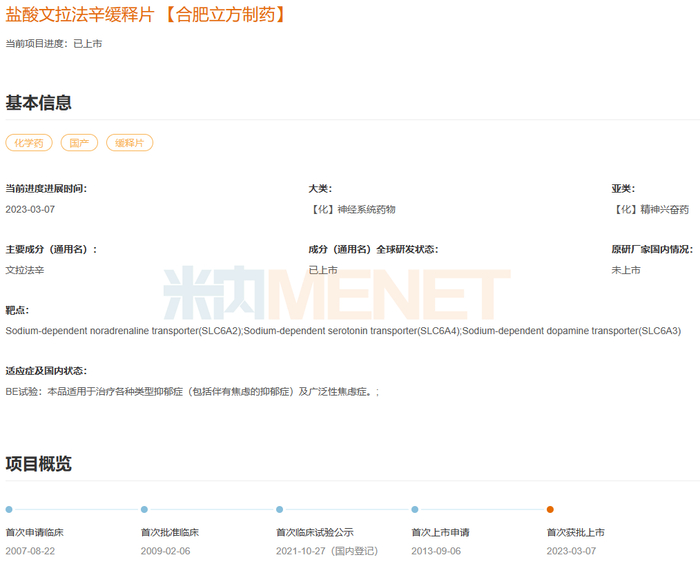 近日,合肥立方制药以仿制3类报产的盐酸文拉法辛缓释片获批,成为该产品第3家获批企业。盐酸文拉法辛缓释片主要用于治疗抑郁症(包括伴有焦虑的抑郁症)及广泛性焦虑障碍,原研企业为美国OSMOTICA,产品未在国内上市。