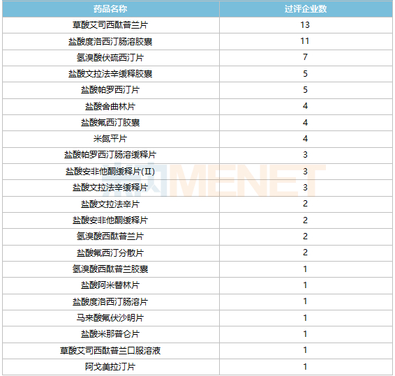 截至目前,抗抑郁药有22个品种过评,草酸艾司西酞普兰片过评企业最多,达13家;其次是盐酸度洛西汀肠溶胶囊有11家。此外,7个品种仅有1家企业过评,分别是四川科伦药业的氢溴酸西酞普兰胶囊、湖南洞庭药业的盐酸阿米替林片、上海上药中西制药的盐酸度洛西汀肠溶片、丽珠集团丽珠制药厂的马来酸氟伏沙明片、上海现代制药的盐酸米那普仑片、成都康弘药业的草酸艾司西酞普兰口服溶液、江苏豪森的阿戈美拉汀片。