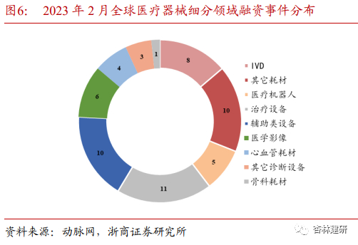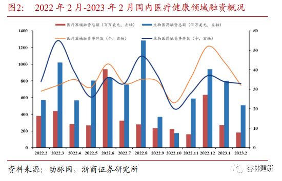 国内:生物医药和医疗器械投融资热度继续回落。2023年2月国内生物医药领域累积发生33起融资事件,融资总额为5.08亿美元,环比下降约37%,同比下降约3%;2023年1月医疗器械领域共发生32起融资事件,融资总额为1.83亿美元,环比下降约32%,同比下降约48%。