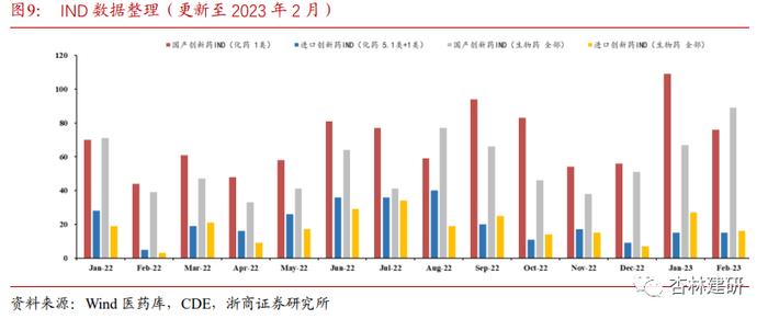 2023年2月,国产创新药IND(化药1类)受理号为76个,进口创新药IND(化药1类+5.1类)受理号为15个,国产创新药IND(全部生物药)受理号为89个,进口创新药IND(全部生物药)受理号为16个。
