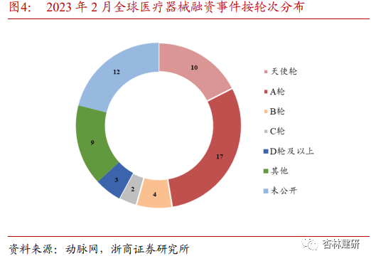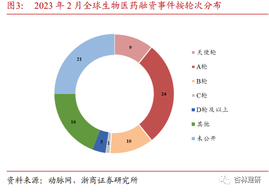 从细分领域上看,生物制药和治疗设备分别是2月全球生物医药和医疗器械投融资关注度最高的板块,投融资事件分别发生了49起与11起。从投资轮次分布上看,A轮是2月医疗器械和生物医药和投融资事件发生数量最多的轮次。
