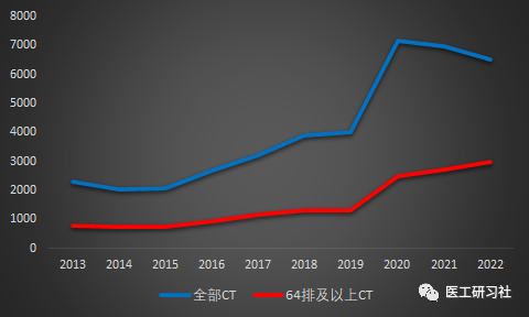 2013-2022年全部CT和64排及以上CT对比
