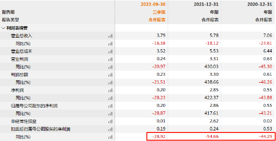 年报显示,海辰药业在2012年-2019年的总营收、总营利都在缓慢增长。但2020年扣非净利润下降四成,2021年再腰斩,2022前三季再降28%。