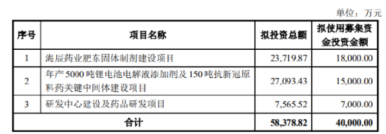 在王永军卸任副总经理的一个月前,即2022年6月,海辰药业发布拟定增公告,称拟募集资金总额不超过4亿元,将用于包括年产5000吨锂电池电解液添加剂在内的项目。