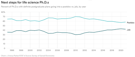 然而,年轻研究人员走出学术界的整体转变已经对现实世界产生了影响。2022年《科学》和《自然》杂志首次报道了这一趋势,许多学院在招聘博士后时遇到了困难。另一数据为这一趋势提供了确凿的数据,继续博士后计划的生命科学毕业生的比例从2010年的70%稳步下降到2021年的近58%。