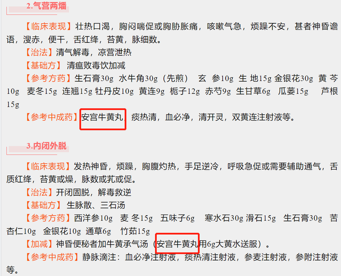 比如3月20日公布的《2023年湖南省春季流感中医药防治方案(试行)》的成人治疗方案中,安宫牛黄丸有如下用法: