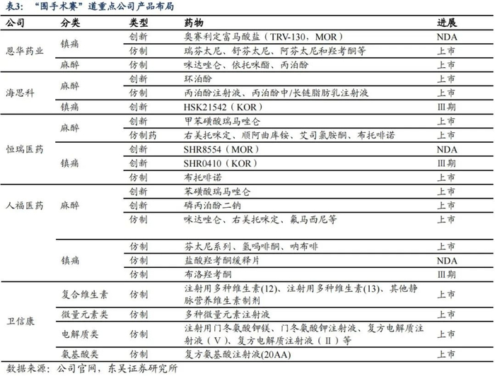 目前,国产麻醉类在市创新药包括海思科的环泊酚、人福医药的磷丙泊酚二钠和苯磺酸瑞马唑仑、恒瑞医药的甲苯磺酸瑞马唑仑(其中只有海思科的环泊酚处于全球注册性临床阶段,今年9月完成临床及数据整理);镇痛类药物方面,几个国产创新药物已经进入三期临床尾声及NDA阶段,包括恩华药业的TRV-130、海思科HSK-21542和恒瑞医药的SHR8554、SHR0410。
