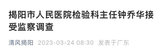 3 月 24 日,“清风揭阳”发布消息,揭阳市人民医院检验科主任钟乔华涉嫌严重违法,目前正接受揭阳市监委监察调查。