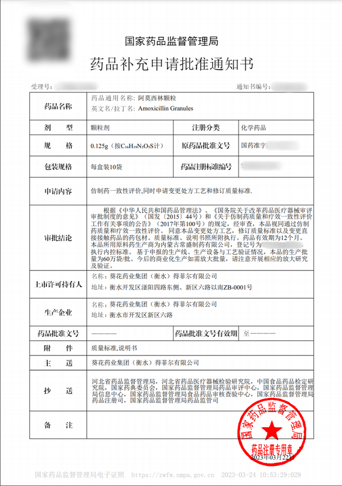 为了提高我公司产品的市场竞争力,落地“产品为王”的竞争策略和葵花工匠精神,经过葵花药业北京药物研究院项目团队的不懈努力,衡水葵花阿莫西林颗粒(0.125g)成功通过国家药品管理局一致性评价。该产品为衡水葵花主要品种之一,于2020年2月开始启动一致性评价项目,2021年6月完成注册申报,2023年3月22号正式通过国家药品监督管理局审评仿制药一致性评价。该品种获批后,成为上市药品目录集收录品种,证明该品种与原研产品的质量、安全性是一致的,具有重要意义。在开展过程,公司获得发明专利一项(一种阿莫西林中蛋白酶残留含量的检测方法,申请号:CN202210528043.1,公开(公告)号:CN115248270A)。再次彰显了葵花研发团队的技术实力和对产品品质的不懈追求,同时为后续产品开展仿制药一致性评价工作积累宝贵的经验。
