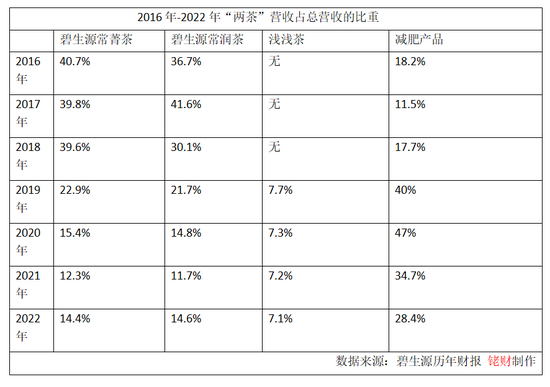 2022年,常润茶、常箐茶(2016年前称减肥茶)收入分别为1.38亿元、1.36亿元,所占公司收入比重为14.6%、14.42%。而高峰时的2010年两茶收入5.66亿元、3.04亿元,占总收入64.8%、34.8%。
