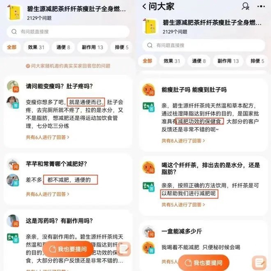 铑财在淘宝碧生源官方旗舰店“问大家”模块发现,大部分卖过的消费者似乎并不将碧生源作为减肥产品购买,仅仅用于通便;而店铺回复中则存在强调产品可以减肥的内容。