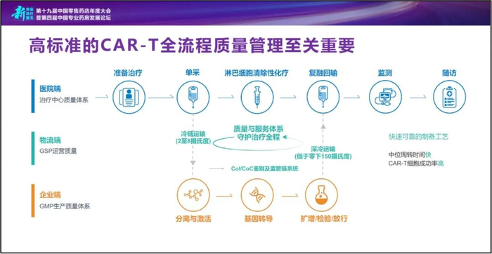 与传统药品相比,自体CAR-T药品是“从血管到血管” 的高度个性化药品,需要医院端、物流端、企业端协同发力,建立起高标准的CAR-T全流程质量管理体系,而专业药房的经营流通管理是其中的重要一环。