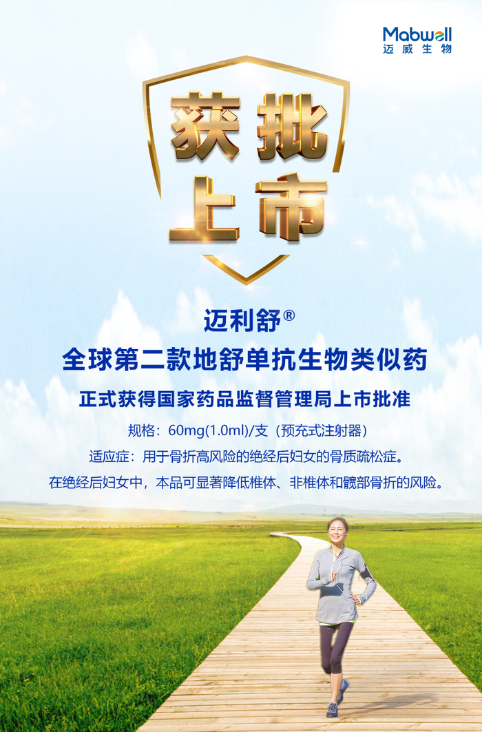 迈威生物(688062.SH),一家全产业链布局的创新型生物制药公司,宣布其全资子公司泰康生物开发的地舒单抗注射液(商品名:迈利舒®,项目代码:9MW0311)正式获得国家药品监督管理局 (NMPA) 上市许可批准 (药品批准文号:国药准字 S20233111)。继君迈康®之后,迈威生物实现了第二款产品的商业化。