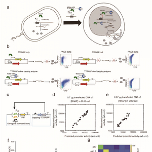 在哺乳动物细胞中,多个基因的先后顺序也会显著影响基因表达量。为了研究基因先后顺序对基因表达量的影响,研究团队设计了三个报告基因的六种可能的先后顺序(1-2-3, 1-3-2, 2-1-3, 2-3-1, 3-1-2, 3-2-1),并计算了报告基因在所有六种组合中的表达量的方差 (图3)。作者们发现同一启动子的表达量的方差系数(CV) 非常小。这个结果表明启动子活性不受其局部基因环境的显著影响,而且在CHO和HEK293T细胞株中都保持类似行为。另外,研究团队在50个启动子库中,针对三个不同报告基因任意选择其启动子(活性变化100倍左右)。通过修正的热力学模型,文章预测了三种报告基因的活性。根据实验结果发现哺乳动物细胞中的三个基因的蛋白表达量都可以由模型预测(R2=0.81~0.88)。