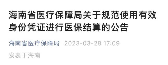 3 月 28 日,海南省医保局发布公告,为贯彻落实《海南省医疗保障局关于规范使用有效身份凭证进行医保结算的通知》(琼医保〔2023〕32号)要求,自 2023 年 4 月 1 日起,全省各定点医药机构须严格执行实名制就医购药等相关规定,做好医保结算有效身份凭证的核验,严禁在 HIS 系统手工录入参保人身份证号、社保卡号等方式进行医保结算。参保群众须持有效凭证(身份证、社保卡、医保电子凭证)才能正常报销。