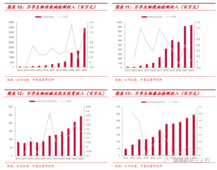 ➢慢病检测:2022年收入9.39亿元,同比增长2.55%。受到新冠疫情的反复扰动,公司慢病业务的增速略有放缓。公司聚焦心血管疾病、出凝血疾病、呼吸急症等危急重症领域,发挥现有免疫荧光、化学发光的仪器终端覆盖优势,不断发掘发热鉴别及重症预警等终端需求;2022公司化学发光业务实现快速增长,活跃仪器数、仪器单产提升显著,同时在海外市场借助新冠业务所带来的品牌效应和渠道网络加快业务拓展,在主要人口大国持续取得业务突破,我们预计2023年慢病业务有望迎来良好复苏。➢传染病检测:2022年收入39.36亿元,同比增长136.02%,受新冠产能挤兑影响常规增速或有所下降。公司深耕现有重点单品,加快新品布局和新型终端的开发,流感检测等产品实现快速增长,同时伴随海外诸国财政资源的持续恢复,多个发展中国家的常规传染病订单量迎来复苏;随着国内诊疗需求的持续回暖,我们预计2023年传染病业务有望迎来恢复式高增。➢毒品检测:2022年收入2.94亿元,同比增长8.78%。公司持续推动中美研发团队一体化,加强美国本地化FDA注册体系,并积极推动唾液、毛发等差异化毒检新品的导入,为客户提供更便捷的检测服务;同时在渠道端持续开拓电商渠道,我们预计公司毒品业务有望保持良好增长趋势。