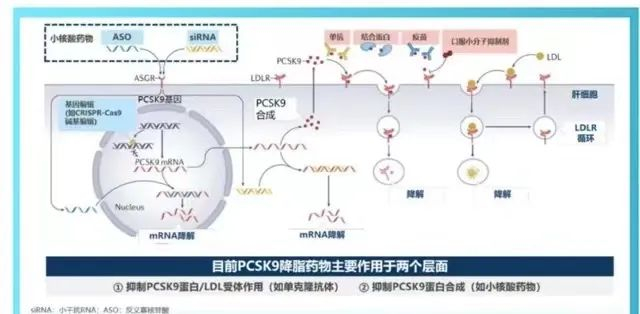 目前,以PCSK9为靶点的降脂药物主要作用于两个层面,即抑制PCSK9蛋白和LDL受体作用(如单克隆抗体)和抑制PCSK9蛋白合成(如小核酸药物)。
