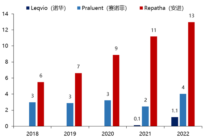 截至目前,全球共有3款PCSK9抑制剂获批上市,分别是安进的依洛尤单抗注射液、赛诺菲的阿利西尤单抗注射液和诺华的Inclisiran,2022年全球PCSK9抑制剂市场规模已达到18亿美元。