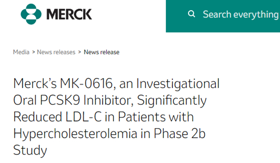 近日,默沙东宣布旗下在研产品PCSK9抑制剂MK-0616在2期临床研究中可显著降低高胆固醇血症的LDL-C(低密度脂蛋白胆固醇),或有望成为全球首款口服PCSK9抑制剂。