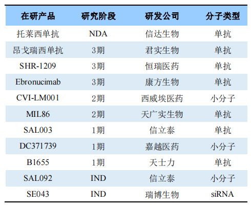 国内在研PCSK9药物在研情况(列举)