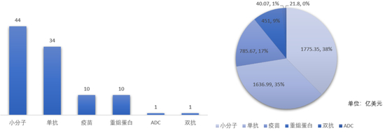 可以看出,小分子和单抗类药品无论数量还是销售总额都是TOP100榜单占比最多的两种型,市场份额逐年递增。