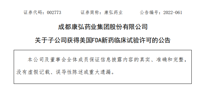 成都康弘药业集团股份有限公司(以下简称“公司”)子公司四 川弘合生物科技有限公司(以下简称“弘合生物”)于北京时间 2022 年 7 月 29 日收到 U.S. Food and Drug Administration(美国食品药 品管理局)的通知,同意 KH617 开展新药临床试验。