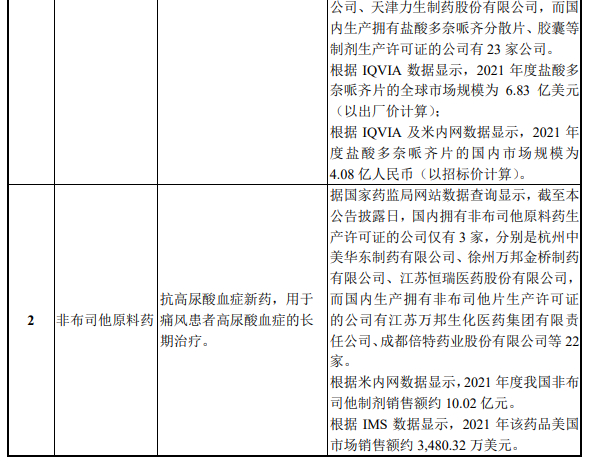 经查询,美国境内目前有包括注射用盐酸万古霉素 500mg/瓶、1g/瓶参比制剂在内的11家产品上市,该产品2021年美国市场销售额约 2.08亿美元。