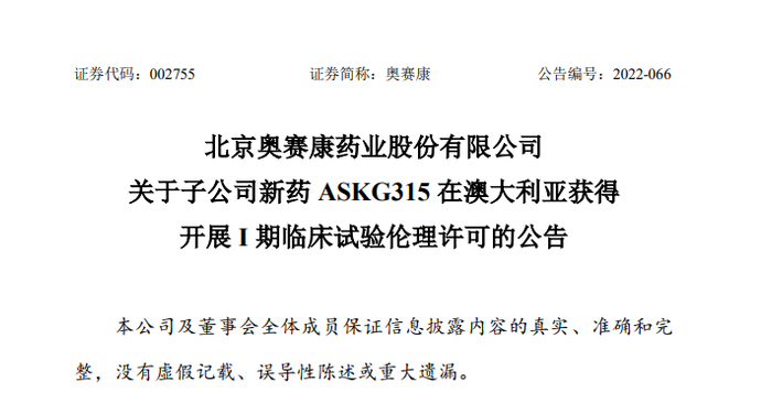 北京奥赛康药业股份有限公司(以下简称“公司”)的子公司江苏奥赛康生 物医药有限公司(以下简称“奥赛康生物”)于近日收到澳大利亚人类研究伦理 委员会签发的批准 ASKG315 开展 I 期临床试验的临床试验伦理许可,并将向澳 大利亚药品管理局(以下简称“TGA”)进行临床试验备案。根据澳大利亚药品注册相关法律法规要求,临床试验备案后,公司即可开展 该产品 I 期临床试验。公司将于近期开展相关临床试验。
