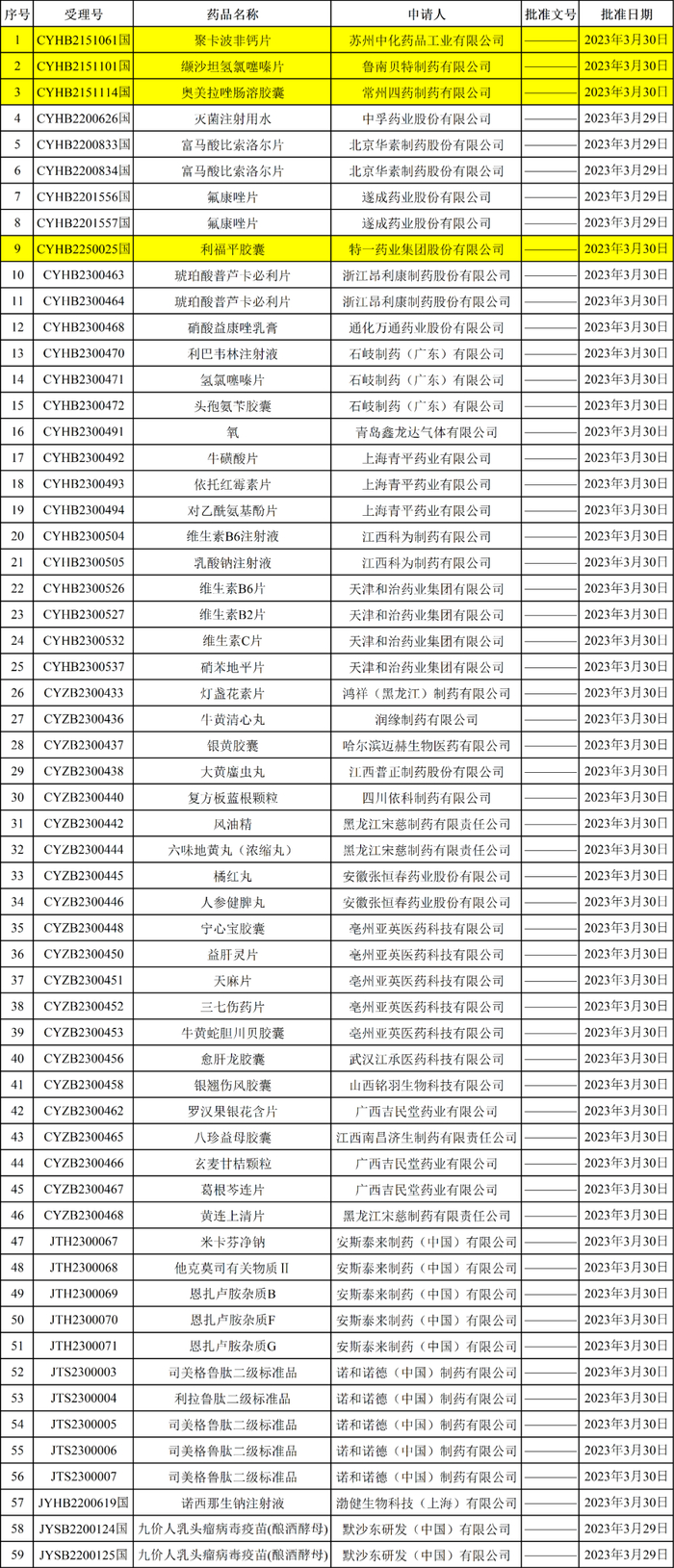 刚刚,NMPA发布2023年04月03日药品批准证明文件送达信息,本批次共有59个受理号获批,其中4个为一致性评价受理号,分别为: