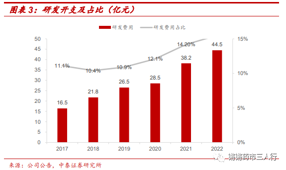 ■四大治疗领域亮点频频,研发管线不断丰厚。公司2022年研发投入44.5亿元,同比增长16.5%,占收入比重约15.5%,继续保持高强度研发投入。