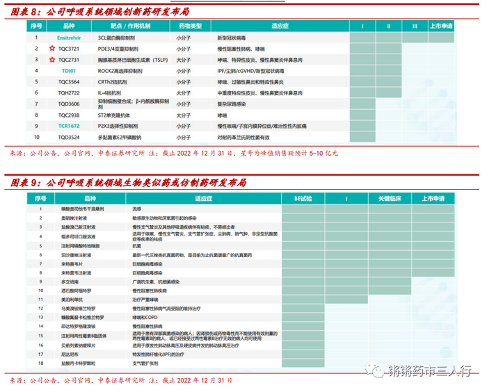 ■ 4)呼吸系统领域:①天晴速畅(吸入用布地奈德混悬液):2022年受集采影响同比略有下滑,预计在集采冲击后有望逐步企稳回升;②TDI01(ROCK2高选择性抑制剂):目前处临床II期,后续将持续加大开发尘肺病、肺纤维化以及移植物抗宿主病适应症;③恩司特韦(Ensitrelvir): 目前已向国家药监局CDE提交上市申请,或将成为COVID-19治疗领域的优质口服药物;④其余管线:截止2022年底,公司呼吸系统领域共有10个创新候选药物处临床申请以上阶段,其中1个处上市申请阶段,5个临床II期,4个临床I期。此外,公司还拥有16个呼吸系统领域的生物类似药或仿制药品种处临床申请以上阶段,包括6个处上市阶段,2个临床III期,1个临床I期以及7个处BE阶段。整体来看,预计未来三年(2023-2025年)呼吸系统领域将有1个创新药、8个生物类似药或仿制药获批上市。