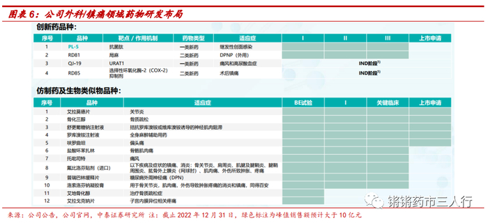 ■ 2)外科/镇痛领域:①得百安(氟比洛芬):2022年持续保持快速增长;②PL-5:抗菌肽产品PL-5是全新设计的首款非抗生素类抗菌药物,抗菌广谱,不易耐药,高效杀菌,对局部开放性创面感染有很好的疗效,目前该产品已完成国内治疗继发性创面感染的III期临床试验,预计2023年申报上市,有望成为国内首个上市的抗菌肽产品;③其余管线:截止2022年底,公司外科/镇痛领域共有3个创新候选药物处临床申请及以上的开发阶段,其中2个处临床III期阶段。此外,公司外科/镇痛领域还拥有10个生物类似药或仿制药品种处临床申请以上阶段,包括4个处上市阶段,5个临床III期,1个处BE阶段。整体来看,预计未来三年(2023-2025年)外科/镇痛领域将有2个创新药和9个生物类似药或仿制药获批上市。