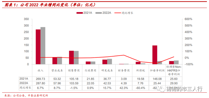 ■ 主业增长稳健,创新药收入占比持续提升。1)2022年收入同比+6.7%,归母净利润-82.6%,我们预计主要系:①2020年投资科兴中维,新冠疫苗销售利润计入应占联营盈利大幅增加,而2022年新冠疫苗销售放缓;②2022年国内疫情反复,终端销售略有波动所致,更能反映公司主业盈利能力的经调整Non-HKFRS归母净利润+16.4%,增长持续强劲。2)此外,收入结构上看,2022年创新药收入约67.5亿元(+20.0%),占营收比重达23.5%(+2.5pp)。3)受益于新产品放量增长,公司抗肿瘤、外科/镇痛、肝病、呼吸、心脑血管等领域分别同比增长14.3%、2.8%、15.4%、-6.5%、7.8%。