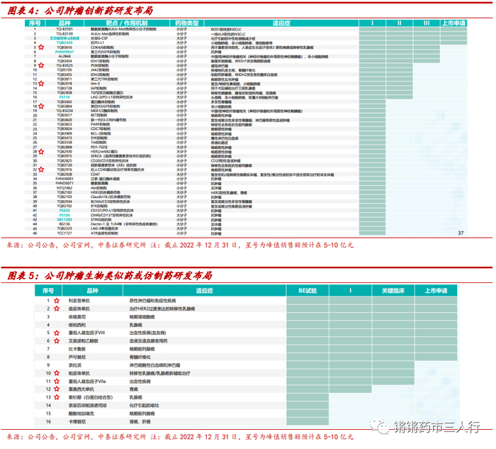 ■1)肿瘤领域:①安罗替尼:2022年获批第五个分化型甲状腺癌适应性。此外,安罗还有10个联用适应症的III期临床正在进行,预计有望在未来两年逐步递交上市申请。销售方面,安罗2018-2022年收入CAGR约39%;②派安普利(抗PD1单抗):2022年获批一线治疗鳞化非小细胞肺癌适应症,二/三线鼻咽癌处上市审评过程中,另外3个一线治疗非鳞化非小细胞肺癌、一线肝细胞癌以及二线治疗胃癌/胃食管交界处癌处III期临床,有望在未来两年逐步递交上市申请;③F-627(艾贝格司亭α注射液):目前处上市申请阶段,F-627无须PEG修饰,相比市场主流的二代产品在安全性上有一定优势,预计2023年有望在国内获批;④其余管线:截止2022年底,公司肿瘤领域共有40个创新候选药物处临床申请以上阶段,其中4个处上市阶段、4个临床III期,7个临床II期,23个临床I期,2个处临床申请阶段。此外,公司在肿瘤领域还拥有15个生物类似药或仿制药品种处临床申请以上阶段,包括8个处上市阶段,3个临床III期,1个临床I期,3个处BE阶段。整体来看,预计未来三年(2023-2025年)肿瘤领域将有8个创新药和11个生物类似药或仿制药获批上市。