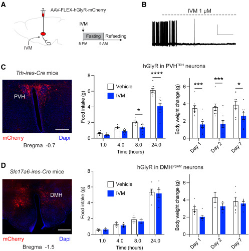 病毒示踪实验发现ARC-AgRP神经元接受来自于PVH脑区促甲状腺素阳性神经元(PVHTRH)和DMH脑区兴奋性神经元输入(DMHVglut2),研究发现,PVHTRH和DMHVglut2谷氨酸输入的突触变化显著不同,为了进一步阐明其内在机制,研究者采用化学遗传学方法在禁食期间沉默小鼠的PVHTRH或DMHVglut2神经元(注射AAV-FLEX-hGlyR-mCherry并全身性施用IVM)。研究发现,PVHTRH神经元的活动对于体重反弹机制十分重要,而DMHVglut2神经元对食物摄入和体重反弹没有显著影响。
