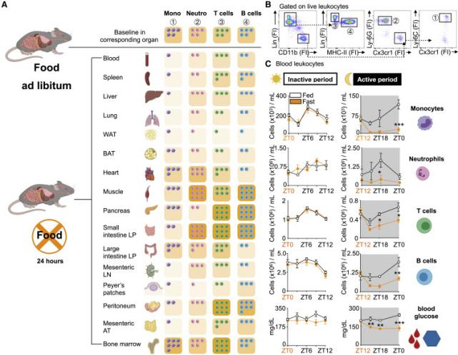 为了深入了解禁食对免疫系统的影响,研究人员将小鼠分为2组,一组醒来后立即摄食,而另一组则执行禁食,禁食时间从较短时间约几小时到更长的24小时。研究人员分为在小鼠醒来时(基线)、醒来4小时、醒来8小时后收集分析两组的血液样本,统计了16个器官和组织中的主要白细胞数量,如B淋巴细胞(B cells)、T淋巴细胞(T cells)、单核细胞(Mono)和中性粒细胞(Neutro),并分析了24小时内禁食期内,各种白细胞的变化趋势。