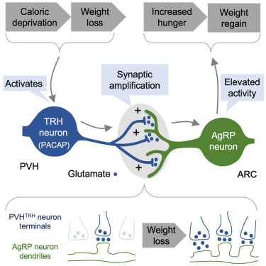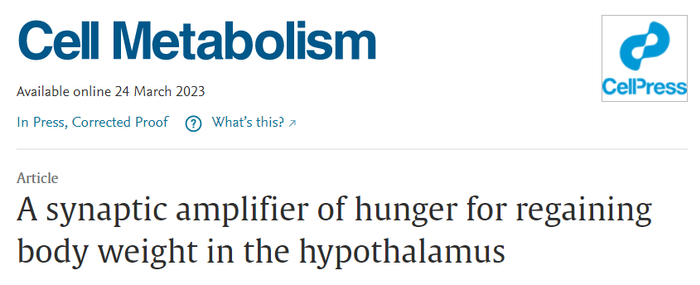 2023年3月24日,德国马克思·普朗克代谢研究所与美国哈弗医学院在Cell Metabolism杂志联合发表了一篇题为“ A synaptic amplifier of hunger for regaining body weight in the hypothalamus ”的论文,研究发现节食后体重反弹主要是因为神经突触PVHTRH/ AgRP的兴奋,诱发禁食后的大脑触发更强的饥饿信号,进而导致摄食量和体重增加。
