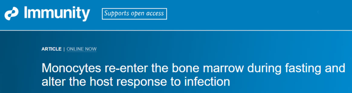 2023年2月23日,美国西奈山伊坎医学院在 Cell 子刊 Immunity 发表题为 :“ Monocytes re-enter the bone marrow during fasting and alter the host response to infection ”的论文,尽管禁食对健康有很多益处,该论文研究发现,长时间禁食会影响机体免疫系统,不仅不利于抵抗外界感染,还会增加多种疾病的患病风险,甚至导致更高的死亡率。