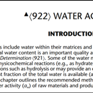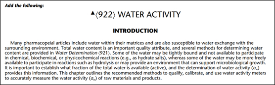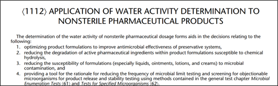 USP 率先将水分活度应用于制药领域的微生物控制,代表了非无菌制剂的微生物控制由微生物限度测试逐渐向微生物风险评估下的参数放行转变的发展趋势,其理念更为科学合理,控制方法更为简便灵活。目前相关指导原则有USP<922>和USP<1112>。USP<1112水分活度测定在非无菌制剂中的应用于2006年发布,用以指导水分活度在非无菌制剂微生物控制中的应用,包括一系列微生物生长需要的水分活度数据和基于产品水分活度的微生物限度检查建议,推荐水分活度的测量方法等内容。