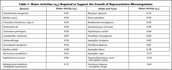 革兰阴性菌,如铜绿假单胞菌、大肠埃希菌和沙门氏菌在aw<0.91 的产品中不会增殖,革兰阳性菌,如金黄色葡萄球菌在aw<0.86时不会增殖,黑曲霉在aw<0.77 时不会增殖。