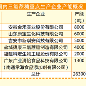 我国的三氯蔗糖生产相对集中,重点企业包括安徽金禾、山东康宝、吉安市新琪安、盐城捷康、福建科宏生等,这些企业均占有较大的市场份额。近些年来,根据市场变化,国内企业采取技术改进、扩大规模、完善产业链等举措,有效地提高了竞争力。其中,安徽金禾扩产至8000吨,山东康宝技改后产能达6000吨。预期未来三年,国内企业的产能还将逐步释放。