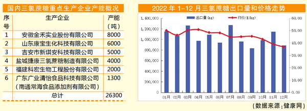 2018年,出口量超过5200吨;2021年,出口量9700吨;2022年,出口量突破1万吨(达1.26万吨,不包括三氯蔗糖溶液),出口金额约5.77亿美元,均价45.82美元/kg。2022年上半年,市场价格基本稳定在高位;2022年下半年,价格小幅下滑,尤其是第四季度成交价格明显下降,12月均价为36.73美元/kg。