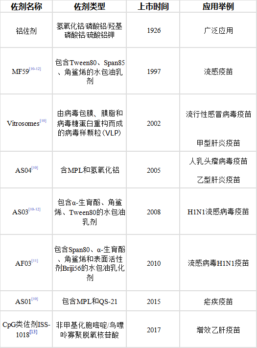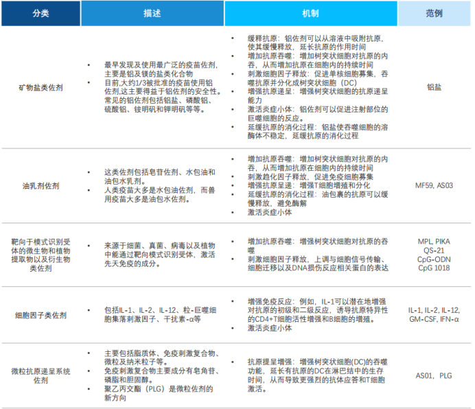 根据FDA的《佐剂和佐剂预防性疫苗安全性评估的监管考量》,佐剂可大致分为三大类。第一大类包括增强抗原递呈细胞和/或淋巴结的抗原递送,从而改善免疫反应的佐剂。例如铝盐、油和水乳剂(如诺华公司的MF59和GSK的AS03)以及脂质体。第二大类包括免疫刺激剂或称免疫增强剂。其主要通过受体介导发送的信号调节免疫反应的质量。例如PIKA双链RNA以及MPL可激活Toll样受体3,Toll样受体4、QS21、CpG、细胞因子等。最后,第三大类由上述前两种类型组合而成,由递送系统和已建立的PRR配体组成,如佐剂系统01(AS01)、AS04和Aloh im-II,称为组合佐剂或“佐剂系统”。