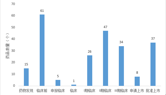 为了尽快填补市场对眼科药物的需求,近年来眼科药物持续获批,越来越多的药企加入到眼科药物的研发和生产中。根据药融云数据库显示,2014年至今,中国共有234个眼科新药,其中处于药物发现阶段的药品共有15个,处于临床前阶段的药品数量为61个,临床阶段而言,II期临床的产品最多,达到47个。