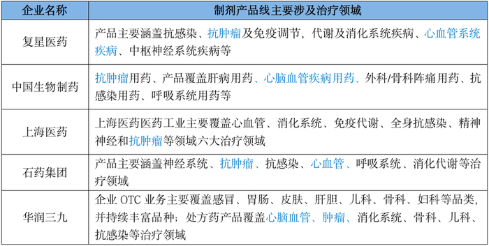 除华润三九年报未按治疗领域/疾病类别明确统计收入贡献外,其余四家200亿级制剂药企均有统计。