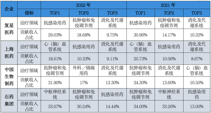 收入分布:百亿制剂药企业务治疗领域收入贡献集中
