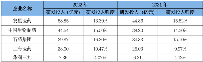 其中,排在第一位的复星医药2022年研发投入接近60亿元;投入强度最大的石药集团达到16.30%,中国生物制药也达到了15.50%。