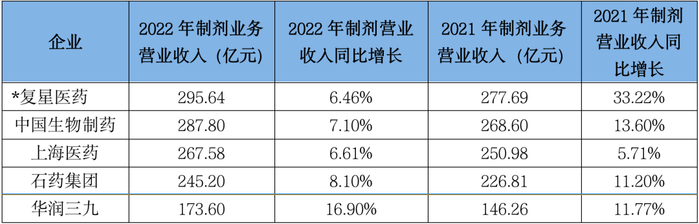 注:数据来源于各上市公司年报,本表仅为药品制剂收入;其中,复星医药是药品制造与研发收入剔除少量原料药和中间体核心产品数据推算。